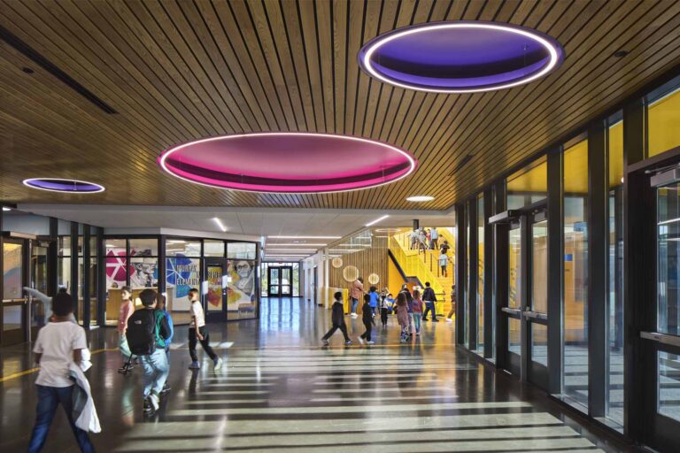 The original design for the wood ceiling system consisted of individual acoustical wood planks, supplied loose, that would then be cut, edge banded, finished, and assembled into a complex herringbone pattern in-field. While achievable, in-field fabrication leaves significant room for error due to traditionally simplistic on-site equipment, ever-changing field conditions, and larger tolerances during assembly. Additionally, the herringbone pattern provided for an added level of difficulty due to the overlapping layout of individual wood ceiling planks. Believing there to be a great benefit to both the installer and end-user in opting for a fully fabricated system, Rulon International, in partnership with the installing contractor, presented an option for fully-assembled panels reconfigured into a chevron pattern and supplied in an A/B paired module to maintain the overall aesthetic of the design. This approach allowed each module A and module B panel, constructed from individual wood planks attached to a routed wood backer panel, to be cut to overall size in-field and directly attached to the deck above, drastically reducing the in-field labor required for fabrication and assembly. The routed wood backer panels have the additional benefit of allowing sound to pass through the white-felt reveals and be trapped in the plenum above, attenuating the overall sound profile of the often lively dining room. Additionally, the change from a herringbone pattern to a chevron pattern limited the complexity of the assembly process, but maintained the overall design aesthetic. The simplified design of the ceiling panels resulted in a beautiful, sound-attenuating wood ceiling system that will continue to be a centerpiece of The Dutch restaurant for the foreseeable future.
