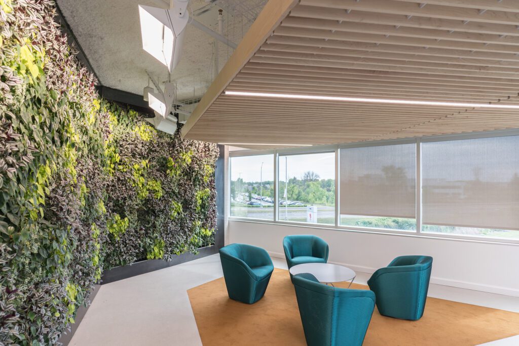 - Embedded sensors within panels that monitor acoustics, temperature, and indoor air quality.
